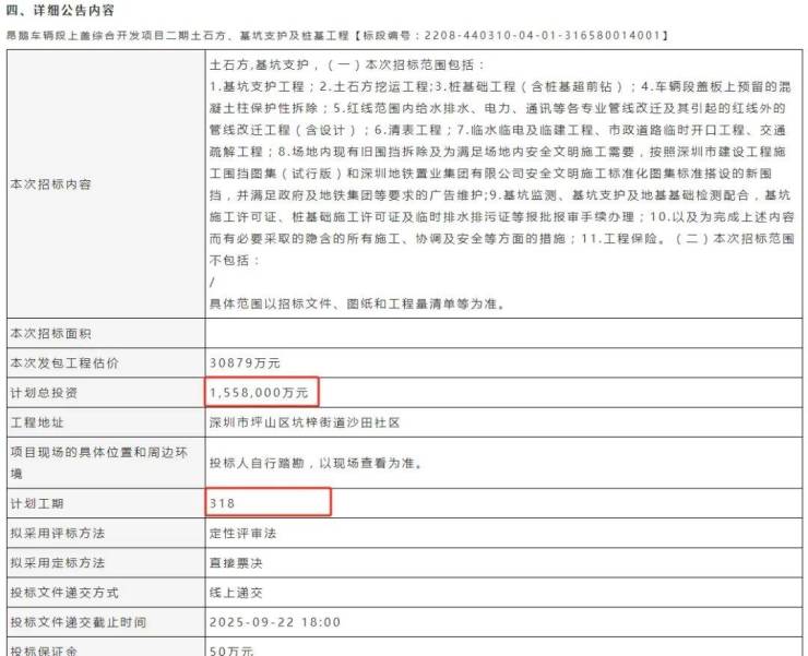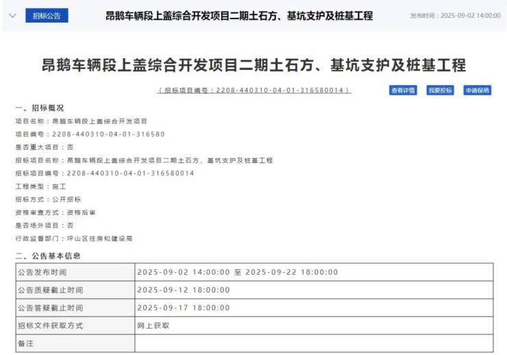 9月2日,深圳公共资源交易中心发布了“昂鹅车辆段上盖综合开发项目二期土石方、基坑支护及桩基工程”的招标公告,招标时间即日起至9月22日。