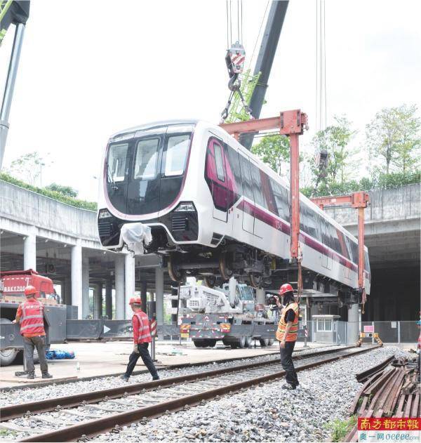 4月29日,一节节“蓝紫渐变色”的地铁11号线新型列车被缓缓放置在轨道上,标志着11号线增购首列车顺利完成交付。 通讯员供图