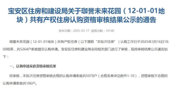 据宝安区住建局消息,鸿荣源珈誉府7区共有产权房认购工作已于2025年3月16日18:00结束,共5264户家庭提交认购申请。