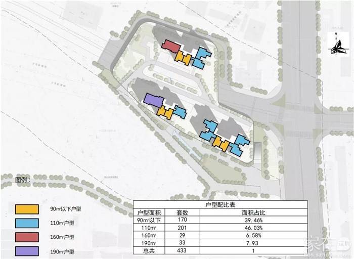 项目共有433套住宅,主力户型为建筑面积约90~110平,其中90平170套,110平201套;此外还有160平29套,190平33套。整体布局2梯4户,2梯5户,2梯6户。