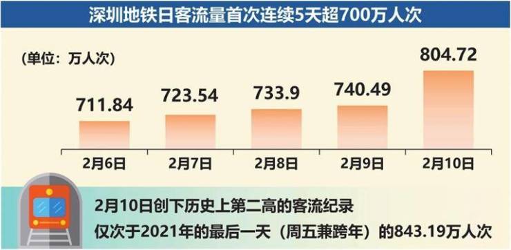 数据显示,自1月28日兔年开工首日起,深圳地铁全网工作日客流保持攀升势头。2月6日至10日五个工作日,深圳地铁全网客运量气势如虹:周一711.84万人次、周二723.54万人次、周三733.9万人次、周四740.49万人次,周五更是突破800万关口,达到804.72万人次。这是深圳地铁历史上第二高的客流纪录,仅次于2021年的最后一天(周五兼跨年)的843.19万人次,也是深圳地铁史上首次连续五天超过700万人次大关。