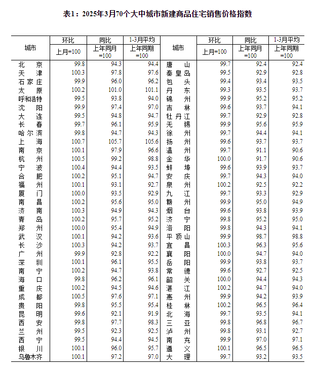 ——国家统计局城市司首席统计师王中华解读2025年3月份商品住宅销售价格变动情况统计数据
