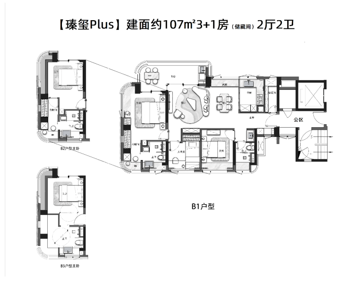 瑧玺Plus款:建面约107㎡3+1房(储藏间)2厅2卫(约80套);