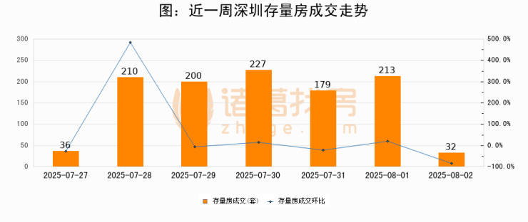 从存量房来看,2025年08月02日深圳存量房单日成交32套,比昨日减少181套,环比下降85%。从近一周存量房成交来看,深圳存量房日均成交套数为156套,08月02日单日成交32套,低于近一周平均水平79.5%。