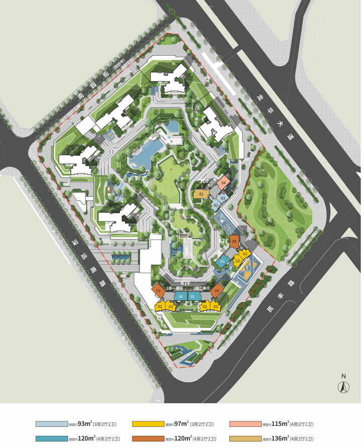 中洲迎玺花园首批将推的楼栋户型分布示意图,均为靠南部的4栋超高层。将推的户型面积段主要有建面93㎡、97㎡、115㎡、120㎡、136㎡产品,其中97㎡、120㎡为主力户型。