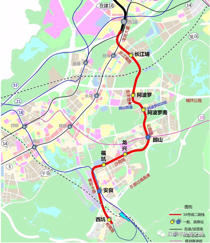 地铁16号线二期线路由16号线一期工程起点大运站引出,沿龙岗大道、长江埔路、公园路、沙荷路、惠盐中路敷设,终至西坑站