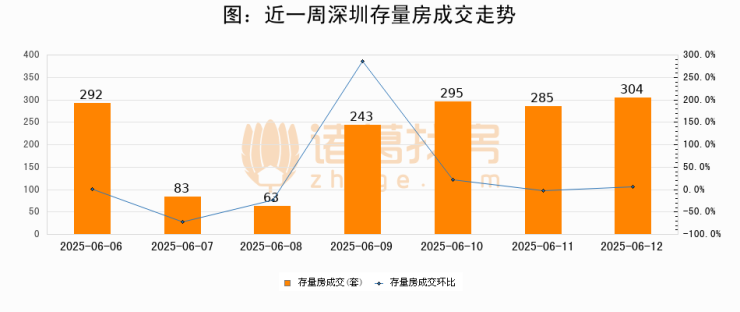 从存量房来看,2025年06月12日深圳存量房单日成交304套,比昨日增加19套,环比上涨6.7%。从近一周存量房成交来看,深圳存量房日均成交套数为223套,06月12日单日成交304套,高于近一周平均水平36.3%。