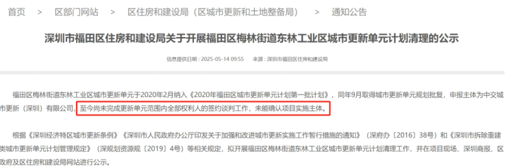 今年5月,福田住建局曾公示该旧改项目拟进行计划清理的信息。