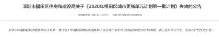 7月15日,深圳市福田区住房和建设局发布关于《2020年福田区城市更新单元计划第一批计划》失效的公告。