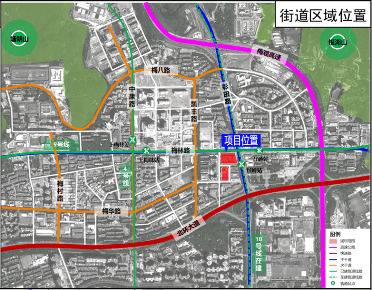 项目位于福田区梅林街道梅亭社区,彩田路与梅林路交汇处的西南侧。项目原拟拆除用地面积16559㎡,拟更新方向为新型产业、教育设施等功能。
