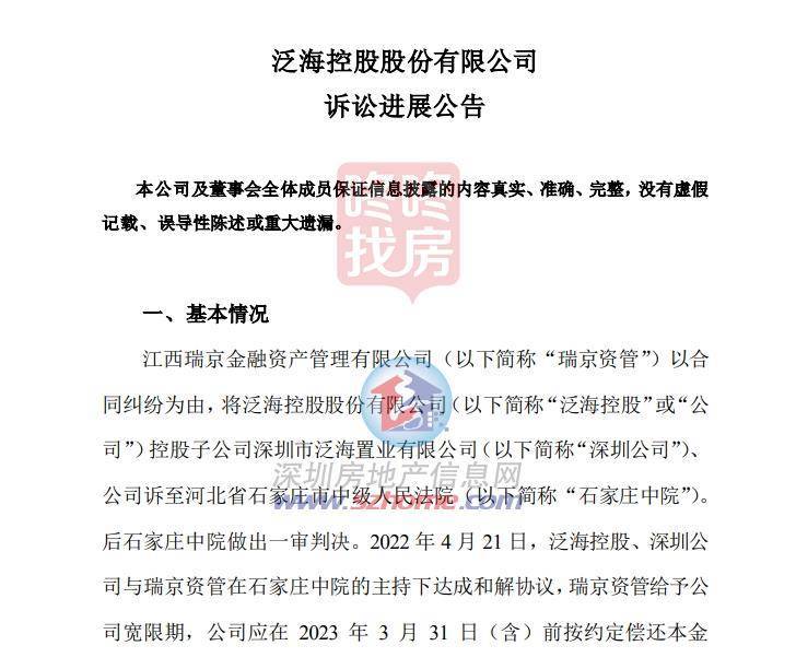 公告显示,此前,江西瑞京金融资产管理有限公司以合同纠纷为由,将泛海控股及控股子公司深圳市泛海置业有限公司,诉至石家庄中院。后石家庄中院做出一审判决。