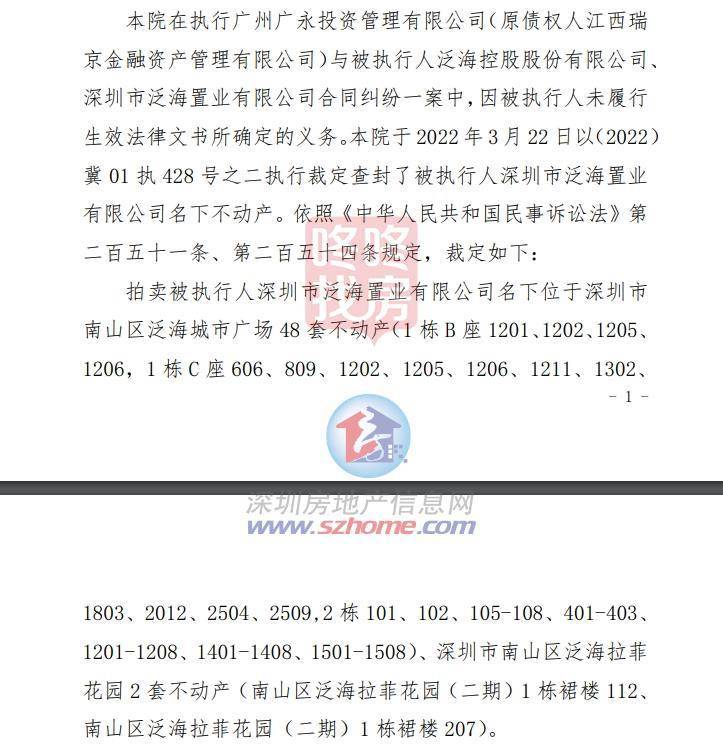 根据拍卖公告,拍卖被执行人深圳市泛海置业有限公司名下位于深圳市南山区泛海城市广场48套不动产(1 栋 B 座 1201、1202、1205、 1206,1 栋 C 座 606、809、1202、1205、1206、1211、1302、 - 2 - 1803、2012、2504、2509,2 栋 101、102、105-108、401-403、 1201-1208、1401-1408、1501-1508)、深圳市南山区泛海拉菲花园 2 套不动产(南山区泛海拉菲花园(二期)1 栋裙楼 112、 南山区泛海拉菲花园(二期)1 栋裙楼 207)。