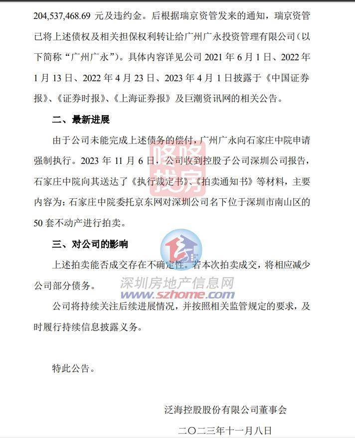 2023年11月6日,泛海控股收到深圳泛海报告,石家庄中院向其送达了《执行裁定书》、《拍卖通知书》等材料,主要内容为,石家庄中院委托京东网,对深圳泛海名下位于深圳市南山区的 50 套不动产进行拍卖。