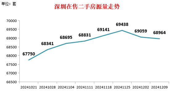 根据公开在售二手房源量数据统计,2024年12月9日,全市共有68,964套有效二手房源在售,较上周减少95套。其中南山较上周减少85套,有效在售11,750套,福田较上周减少76套,有效在售10,107套,龙岗较上周减少16套,有效在售18,307套。