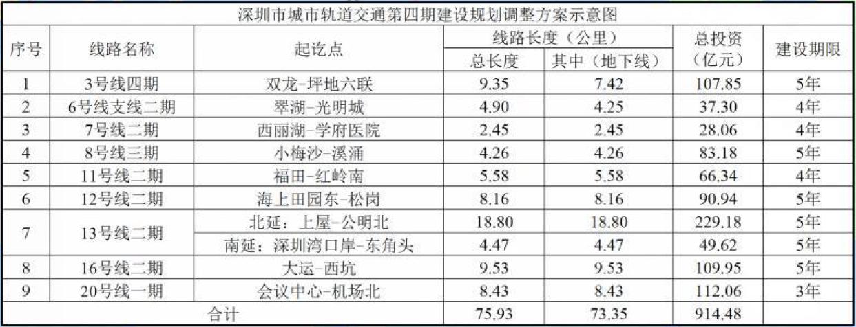 涉及线路有:3号线四期(双龙-坪地六联)、6号线支线二期(翠湖-光明城)、7号线二期(西丽湖-学府医院)、8号线三期(小梅沙-溪涌)、11号线二期(福田-红岭南)、12号线二期(海上田园-松岗)、13号线二期北延段(上屋-公明北)、13号线二期南延段(深圳湾口岸-东角头)、16号线二期(大运-西坑)、20号线一期(会议中心-机场北)。