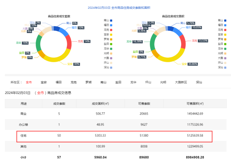 2024年2月3日新房住宅共网签50套。宝安15套;福田5套;龙岗7套;罗湖4套;南山3套;盐田0套;龙华2套;坪山5套;光明2套;大鹏0套;深汕1套。