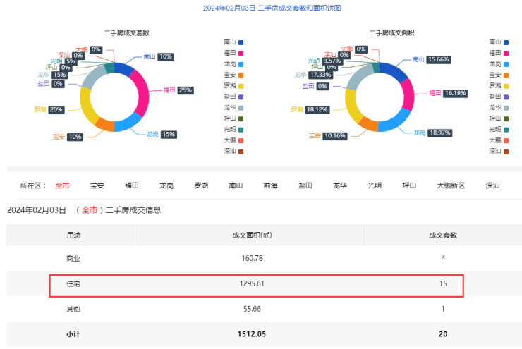 2024年2月3日二手房住宅网签15套。宝安2套;福田2套;龙岗3套;罗湖4套;南山2套;盐田0套;龙华2套;光明0套;坪山0套;大鹏0套。