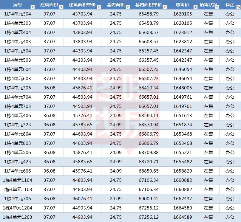 办公建面约54-99㎡,均价约4.2万/㎡,单价区间在3.5-4.7万/㎡,总价区间在162-1224万/套。