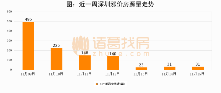 根据诸葛找房数据显示,深圳24小时涨价房源量为31套,较11月14日持平。