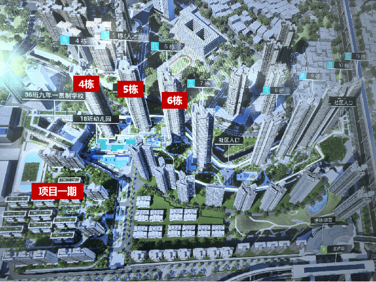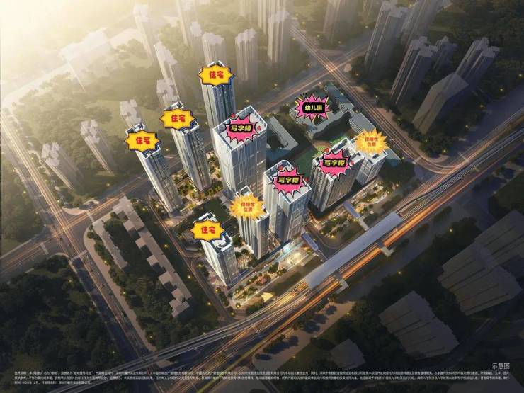 项目由4栋45F超高层住宅、3栋40F、30F写字楼、1栋45F保障房、1栋3F幼儿园以及一所九年制学校组成,未来将建设成为集住宅。