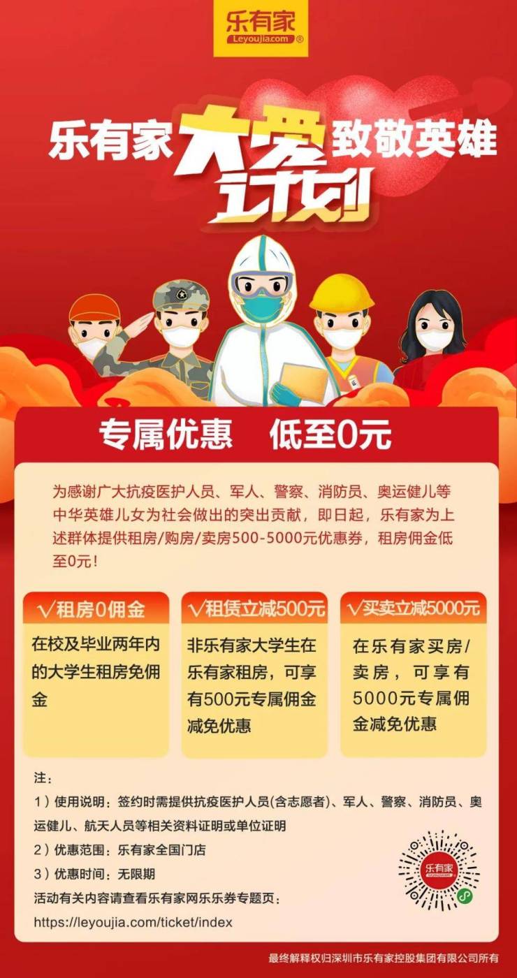 为感谢广大抗疫医护人员、军人、警察、消防员、奥运健儿等中华英雄儿女为社会做出的无私贡献,乐有家于2021年8月推出“大爱计划”,为他们提供定向帮扶计划:租房/购房500-5000元优惠,大学生租房免佣金!至今,乐有家推出“大爱计划”活动刚满一年,在这一年里时间里有包括抗疫医护人员、警察等在内的185人参与了乐有家大爱计划,其中69人通过“大爱计划”活动成功在这里置业。