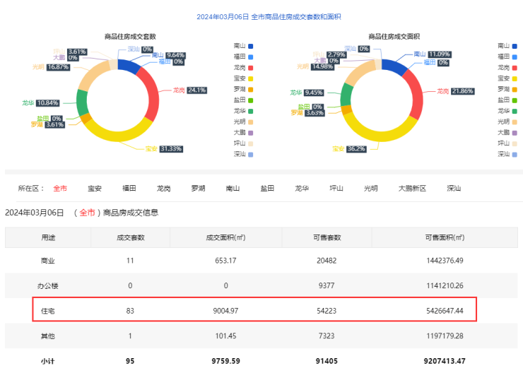 2024年3月6日新房住宅共网签83套。宝安26套;福田0套;龙岗20 套;罗湖3套;南山8套;盐田0套;龙华9套;坪山3套;光明14 套;大鹏0套;深汕0套。