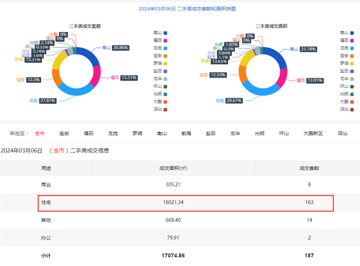 2024年3月6日二手房住宅网签163套。宝安21套;福田21套;龙岗47套;罗湖25套;南山37套;盐田2套;龙华7套;光明3套;坪山0套;大鹏0套。
