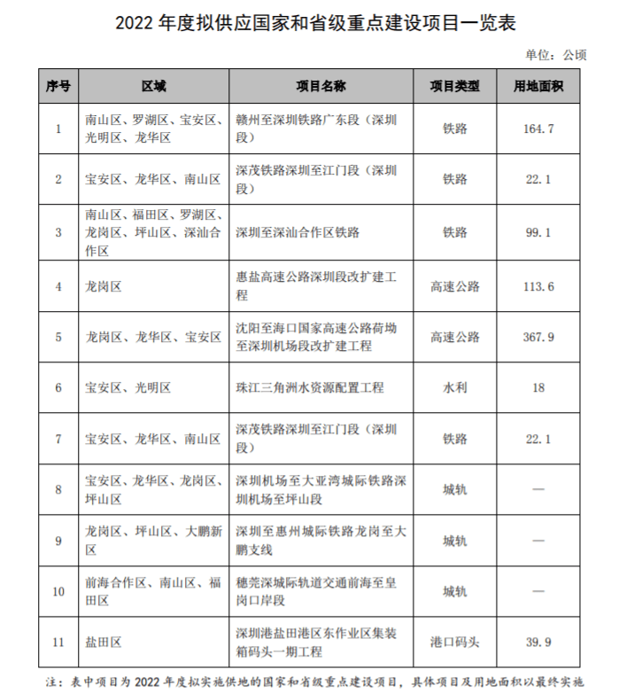 2022年度供应的国家和省级重点建设项目有赣州至深圳铁路广东段(深圳 段)、深茂铁路深圳至江门段(深圳 段)、深圳至深汕合作区铁路、深茂铁路深圳至江门段(深圳 段);