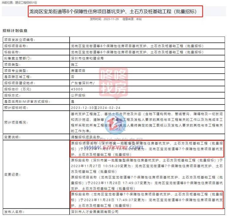 公告中显示,原招标项目名称(深圳市第一批配售型保障性住房基坑支护、土石方及桩基础工程(批量招标))于2023年11月27日 10:58:20变更为:龙岗区宝龙街道等7个保障性住房项目基坑支护、土石方及桩基础工程(批量招标)。