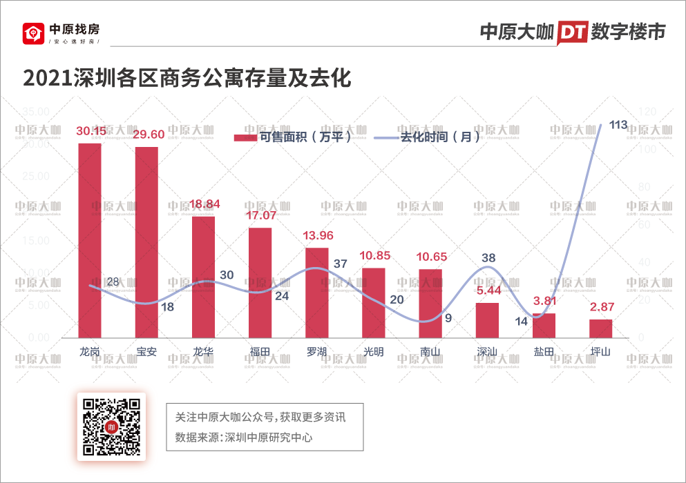 据深圳中原研究中心统计,深圳目前商务公寓存量共143.24万平,可售套数24118套,综合去化时间为23个月。