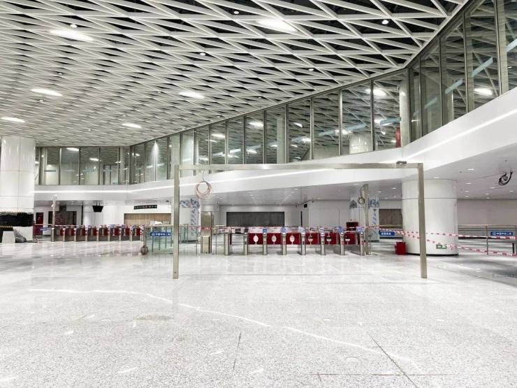 目前车站已基本完成装修,站厅内照明、刷卡闸机、自动售票机等设施均已安装完毕。