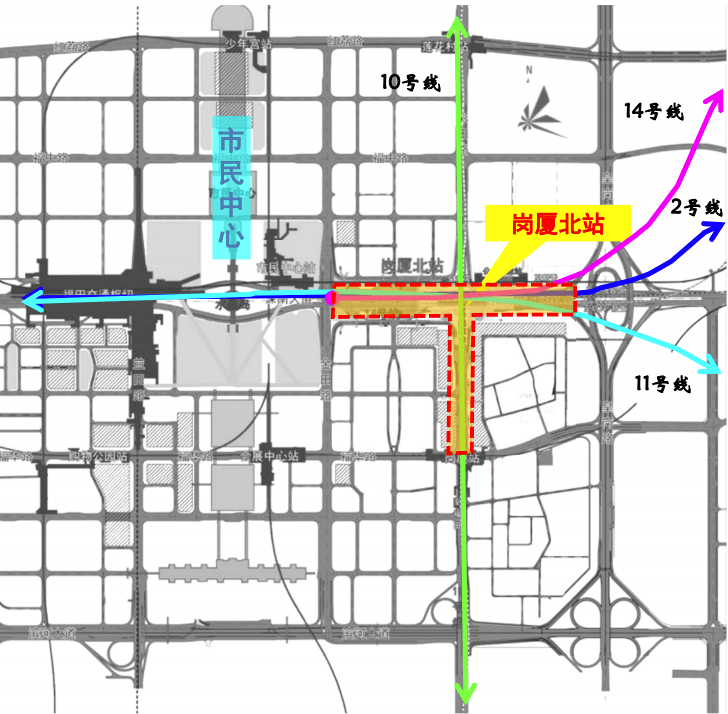 岗厦北枢纽位于市民中心东侧,深南大道和彩田路交叉口;是既有2号线,规划建设中的10、11、14号线四线换乘枢纽。