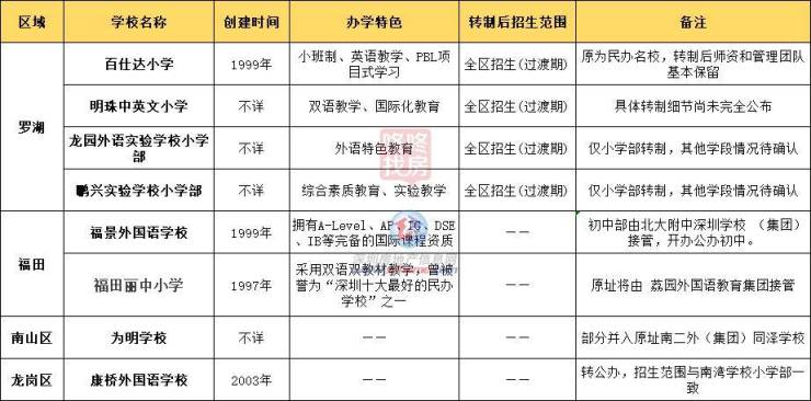 包括罗湖区的百仕达小学、明珠中英文小学、龙园外国语实验学校小学部、鹏兴实验学校小学部,以及福田区的丽中小学、福景外国语学校(初中部)、南山为明学校、龙岗康桥外国语学校等。