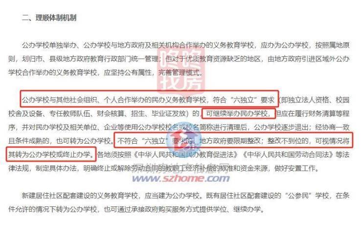 其中提及,公办学校与其他社会组织、个人合作举办的民办义务教育学校,符合“六独立”要求的,可继续举办民办学校;