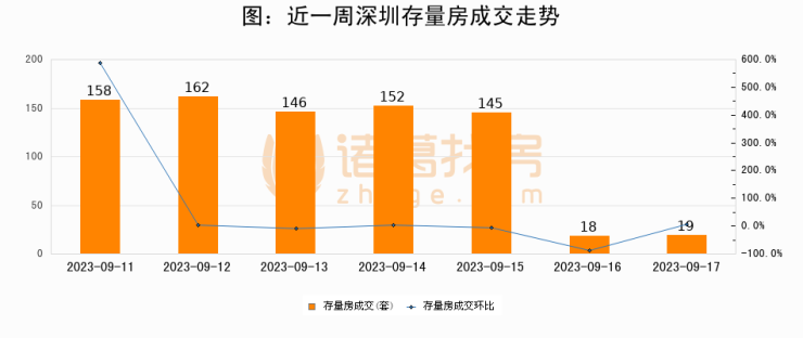 从存量房来看,2023年09月17日深圳存量房单日成交19套,比昨日增加1套,环比上涨5.6%。从近一周存量房成交来看,深圳存量房日均成交套数为114套,09月17日单日成交19套,低于近一周平均水平83.3%。