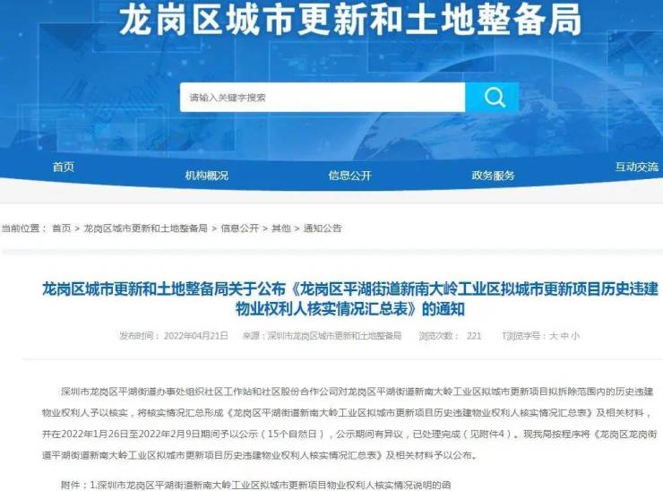 4月21日,龙岗区城市更新和土地整备局发布平湖街道新南大岭工业区拟城市更新项目历史违建物业权利人核实情况的通知。