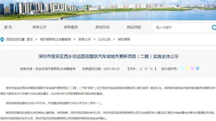 4月22日,宝安区西乡街道臣田国际汽车城城市更新项目(二期)实施主体公示,拟确认深圳市臣田股份合作公司、深圳市臣田投资发展有限公司为项目二期实施主体。