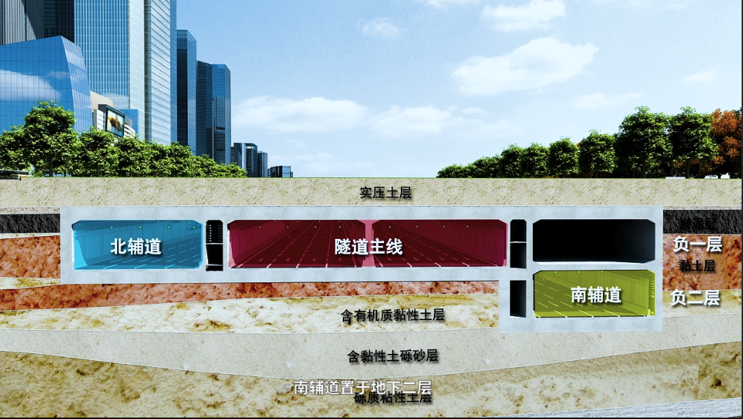 主线下沉隧道暗埋段长度1057米(图示黄色部分)、敞开段503米。