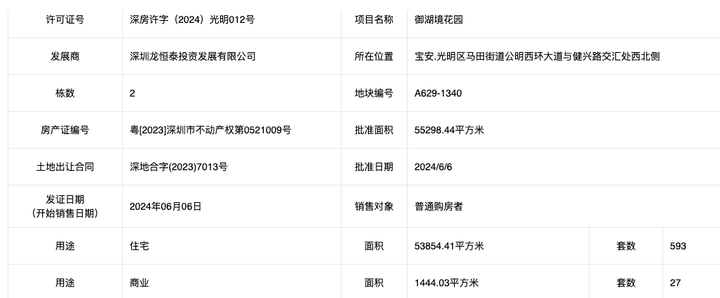 6月6日,光明马田龙湖御湖境花园594套住宅获批预售。