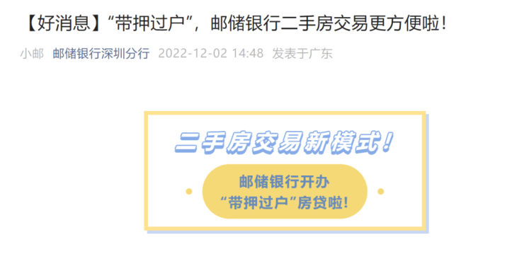 最近,媒体报道,邮储银行深圳分行发布了《【好消息】“带押过户”,邮储银行二手房交易更方便啦!》文章,宣布邮储银行开办“带押过户”房贷业务。