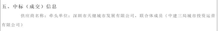 近日,深圳公共资源交易中心公告了龙华民治街道办事处上塘村城中村改造前期服务项目中标(成交)结果,中标人为深圳市天健城市发展有限公司,联合体成员(中建三局城市投资运营有限公司),中标(成交)金额:3400万。
