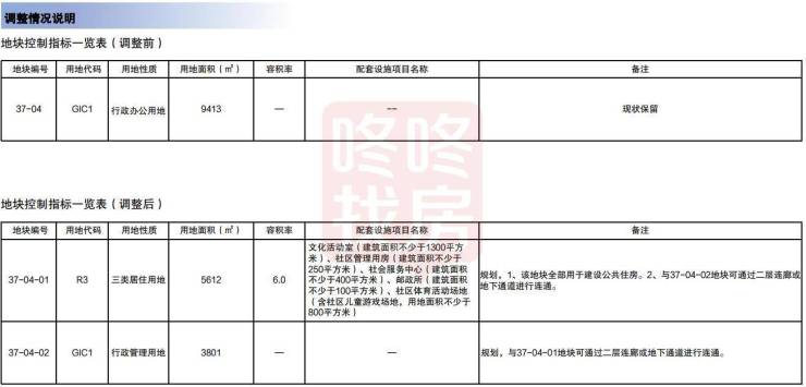 37-04地块分为37-04-01和37-04-02两个地块,37-04-01地块用地面积为5612平方米,用地性质为三类居住用地(R3),容积率6.0,配套设施项目名称为文化活动室(建筑面积不少于1300平方米)、社区管理用房(建筑面积不少于250平方米)、社会服务中心(建筑面积不少于400平方米)、邮政所(建筑面积不少于100平方米)、社区体育活动场地(含社区儿童游戏场地,用地面积不少于800平方米),备注:规划,1、该地块全部用于建设公共住房。2、与37-04-02地块可通过二层连廊或地下通道进行连通;37-04-02地块用地面积为3801平方米,备注:规划,与37-04-01地块可通过二层连廊或地下通道进行连通,其它指标不变。详见附件:调整前后地块控制指标一览表及附图。