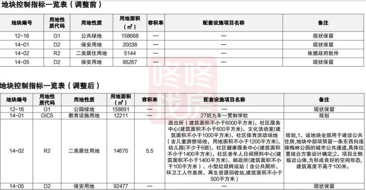 梅林 37-04地块分成两小块,其中一块用地性质变为三类居住用地;梅林14-01、14-02、14-05、12-16地块,一块宅地用地面积扩大,新增一块教育用地,规划27班九年一贯制学校。