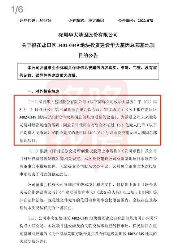华大基因也在8月12日发布公告,董事会已经审议通过了《关于拟在盐田区J402-0349地块投资建设华大基因总部基地项目的议案》,为满足公司未来业务发展对经营场地的需要,同意公司使用自有资金不超过16.5亿元人民币在联合竞买的盐田区J402-0349号宗地投资建设华大基因总部基地项目。