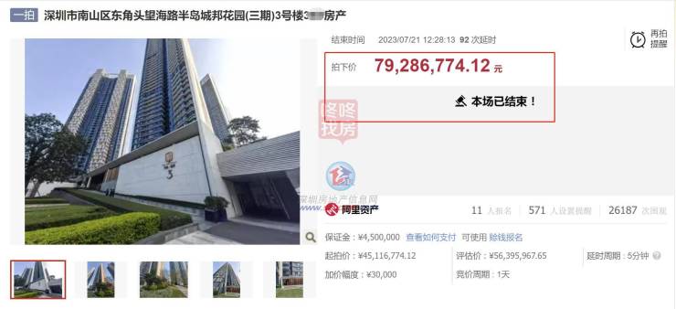 继南山两套半岛城邦法拍房拍出总价1.2亿后,坐深圳豪宅头把交椅的深圳湾壹号,5号楼超大户型法拍房,拍出1.14亿元!现场共有5人报名,近1.5万人次进行了围观,折合单价26.3万元/平。