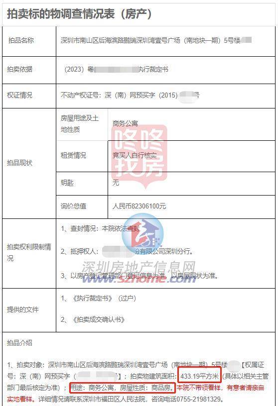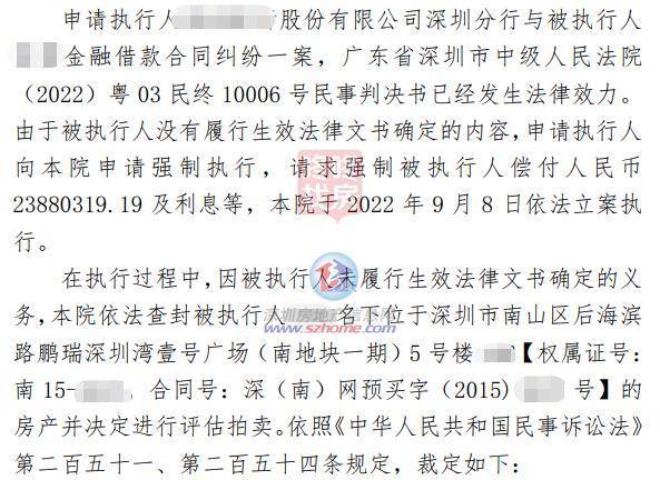 这套豪宅的原业主与深圳某家银行存在金融借款纠纷,欠款本息约2388万元,因此所购豪宅被依法拍卖。