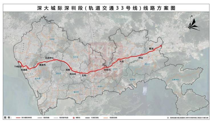深大城际深圳段(轨道交通33号线)共设T4枢纽、机场东、黄麻布、石岩中心、龙胜、民治北、五和、白坭坑、大运、坪山、聚龙共11座车站。