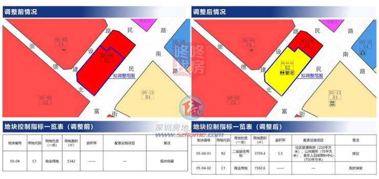 拟将法定图则05-04地块划分为05-04-01、05-04-02两个地块,其中05-04-01调整为二类居住用地,用地面积3759.4平方米,容积率为5.5,配套设施为社区管理用房250平方米、公共厕所70平方米、老年人日间照料中心750平方米;05-04-02地块用地面积1582.6平方米,其余规划指标不变。