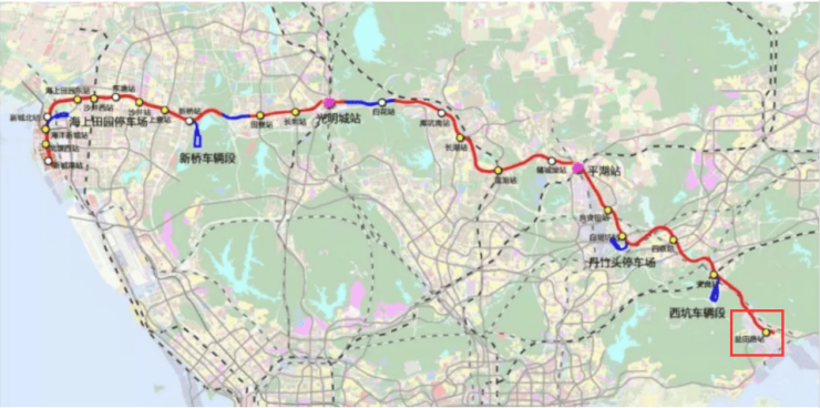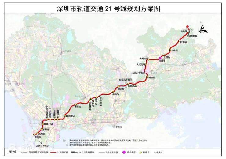 深圳地铁21号线起与前海前保站,东至龙岗吉坑站,连通深圳西南-东北两端。