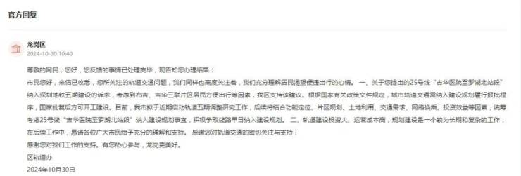 此前有网友提议,25号线考虑五期修编东延至罗湖北站,官方给出的答复是:统筹考虑25号线“吉华医院至罗湖北站段”纳入建设规划事宜,积极争取线路早日纳入建设规划。